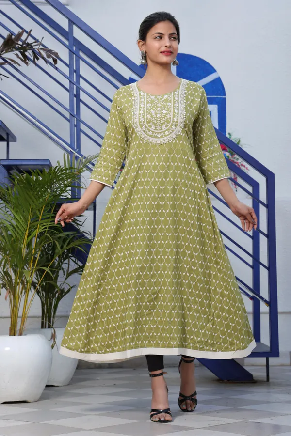 Embroidered Cotton Anarkali Kurta (Light Green)