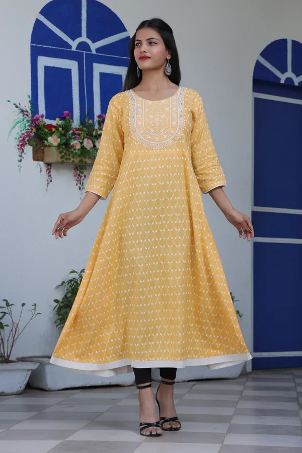 Embroidered Cotton Anarkali Kurta (Mustard)