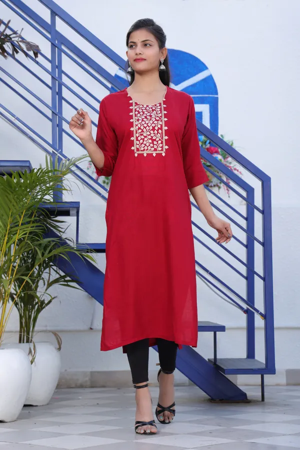 Embroidered Viscose Rayon Straight Kurta (Red)