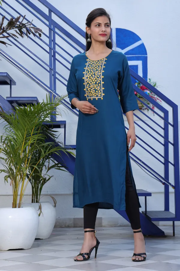 Embroidered Viscose Rayon Straight Kurta (Teal Blue)