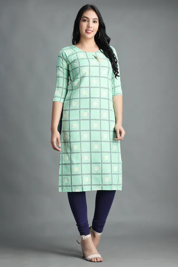 Green Block Print 3/4 Sleeve Cotton Straight Kurta