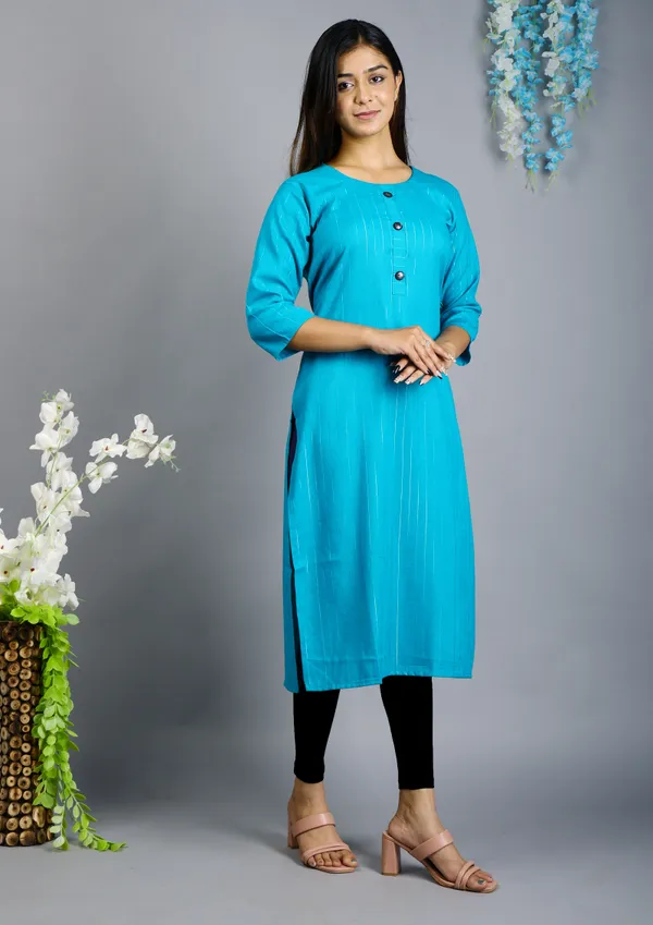 Seablue Striped 3/4 Sleeve Straight Cotton Blend Kurta
